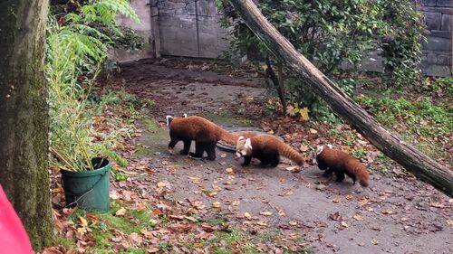 Dort sehen wir drei Rote Pandas. Die Mutter ist mit ihren zwei Jungen im Gehege unterwegs.