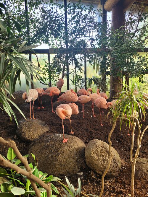 Wir gehen weiter und sehen Flamingos, Pinguine, Papageien und Schneeeulen. Den Erdmännchen schauen wir lange zu. Sie sehen uns aufmerksam an.
