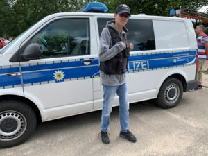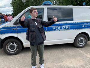 Danach sind wir auf die Wiese gegangen und dort durften wir die Ausrüstung der Polizei anprobieren. Am Ende hat er uns Tricks von den Polizeihunden gezeigt und wir haben ein Gruppenfoto gemacht mit den Polizisten vor dem Polizeiauto. Und dann sind die schon wieder gegangen. Sie waren um die 3 Stunden dort und dann gab es Mittagsessen und Pause.