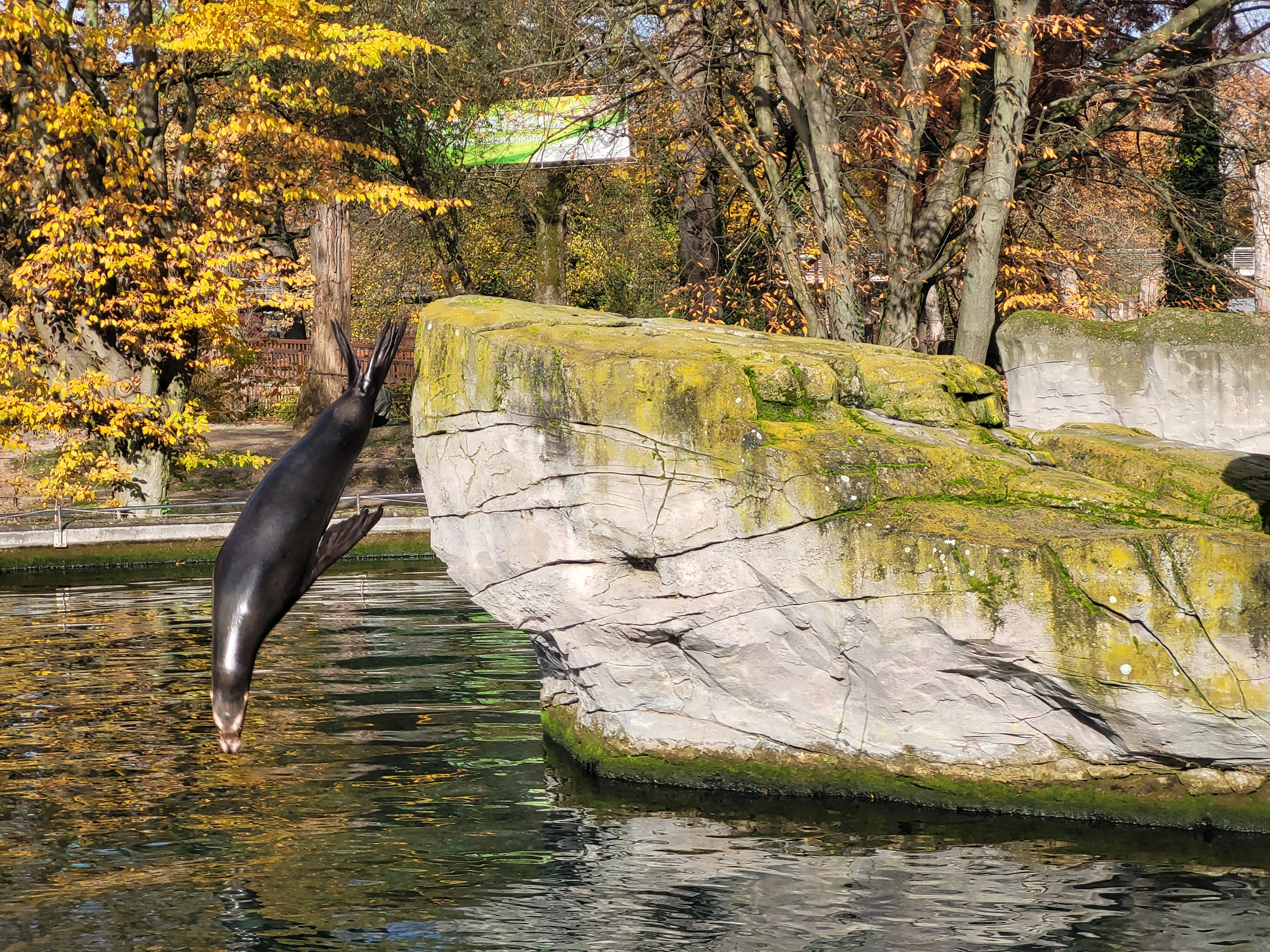Der kleine Eisbär Mika ist gar nicht mehr so klein. Er ist auch schon 1 Jahr alt. Genau zur richtigen Zeit sind wir bei den Seelöwen angekommen. Sie werden gleich gefüttert.